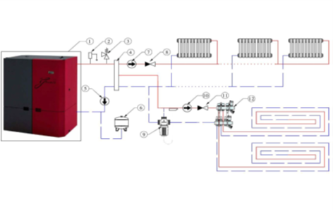 Arzătorul de peleți este încorporat în camera de ardere a cazanului. Cazanul lucrează în mod automat, dozând peleţii cu ajutorul transportorului melcat al rezervorului de peleţi care se află deasupra corpului cazanului.