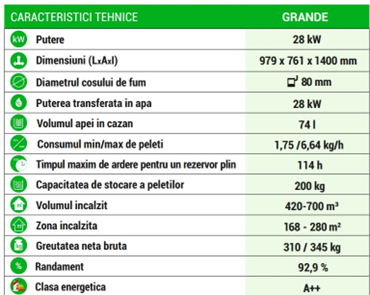 Cazanul poate fi setat să lucreze în 5 trepte de putere. Este dotat cu sistem de autocurățare la fiecare 180 min.